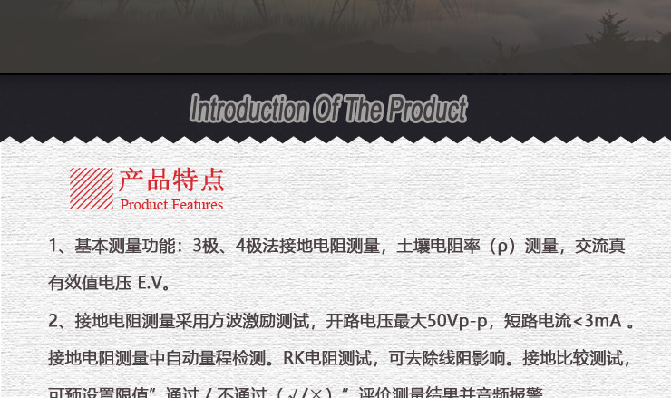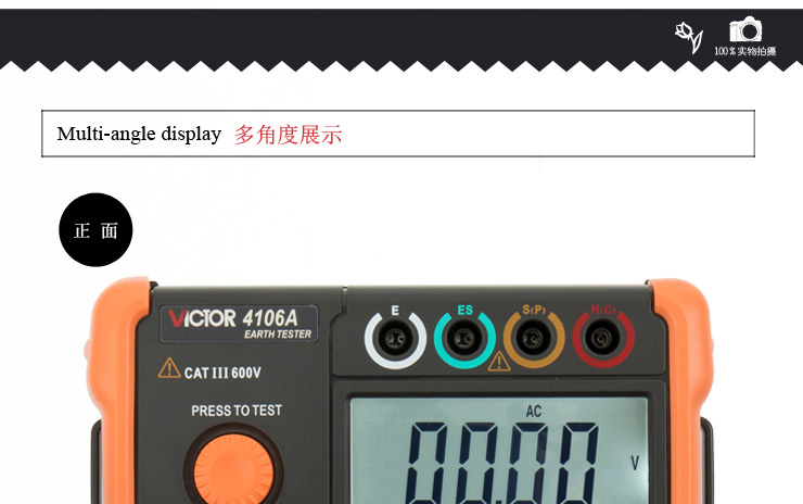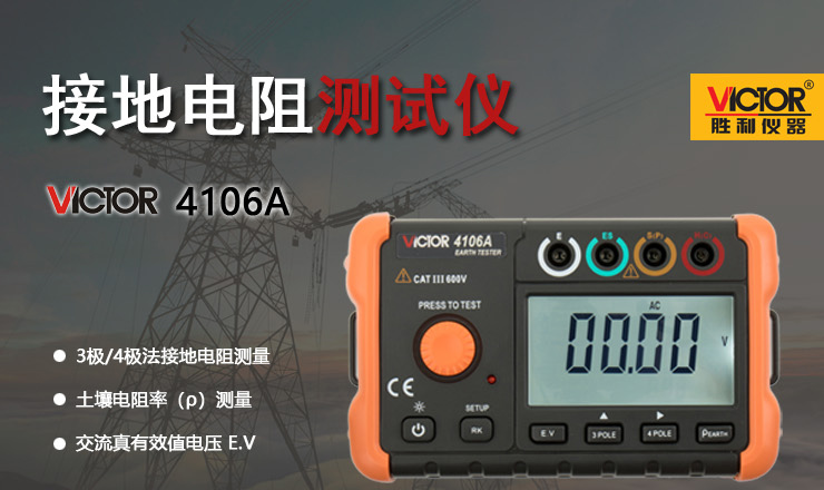 VICTOR 4106A 接地電阻測試儀 產(chǎn)品特點(diǎn): 1、地電壓測量、3極/4極法接地電阻測量、土壤電阻率(ρ)測量