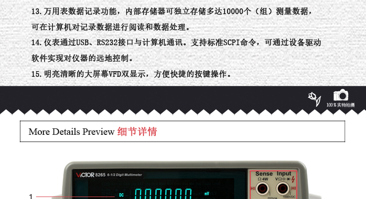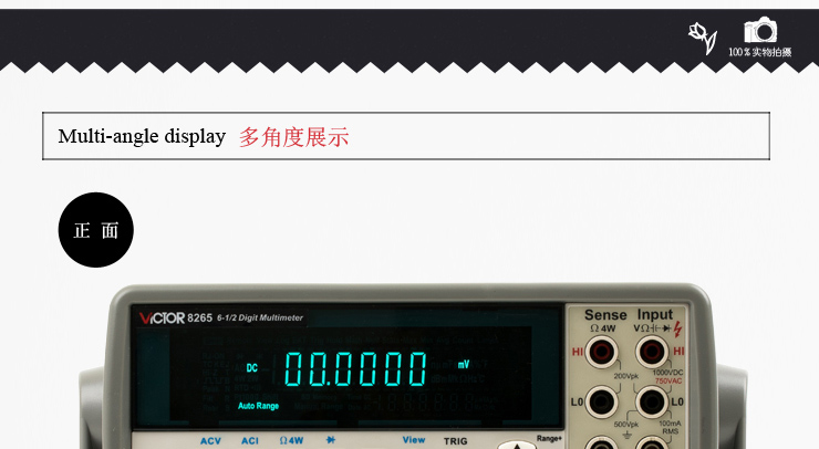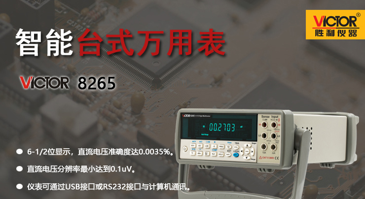 VICTOR 8265是一款智能臺(tái)式真有效值萬用表,本儀表有4-1/2位、5-1/2位、6-1/2位顯示分辨率,最高顯示讀數(shù)值±1200000字,基本直流電壓準(zhǔn)確度高達(dá)0.0035%。