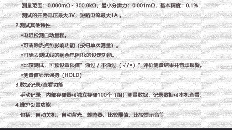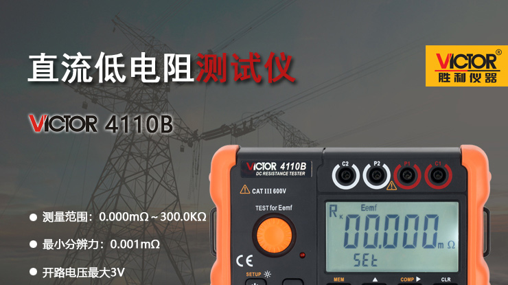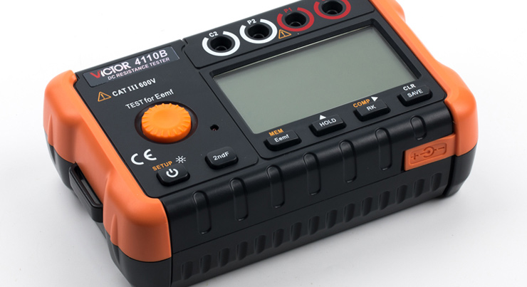 VICTOR 4110B 直流低電阻測(cè)試儀采用直流激勵(lì)4極法測(cè)量,適用于測(cè)量電纜的導(dǎo)線電阻,開(kāi)關(guān)、接插件、繼電器的接觸電阻,線圈、電動(dòng)機(jī)、變壓器繞組的電阻以及金屬鉚接電阻,金屬構(gòu)件之間聯(lián)結(jié)電阻測(cè)試,低值電阻測(cè)試,地網(wǎng)地極間連接導(dǎo)體的電阻測(cè)試,接觸電阻測(cè)試。