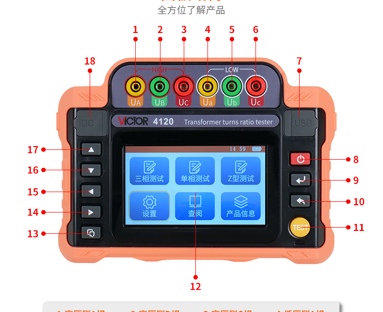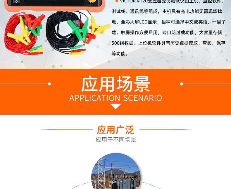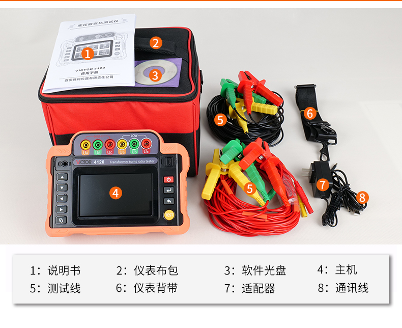 VICTOR 4120變壓器變比測試儀由主機、監(jiān)控軟件、測試線、通訊線等組成。主機具有充電功能無需現(xiàn)場找電、全彩大屏LCD顯示,語種可選擇中文或英語,一目了然,觸屏操作方便易用,端口防過載功能,大容量存儲500組數(shù)據(jù)。上位機軟件具有歷史數(shù)據(jù)讀取、查閱、保存等功能。