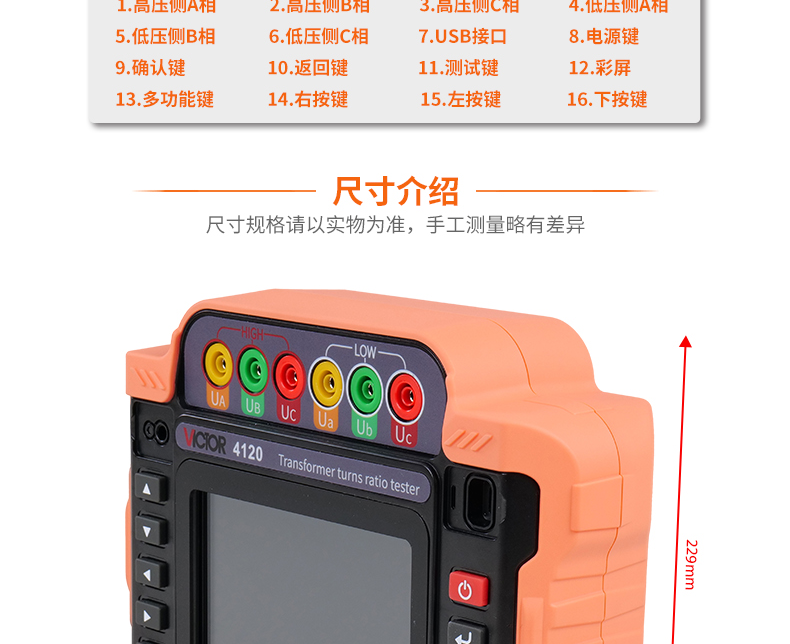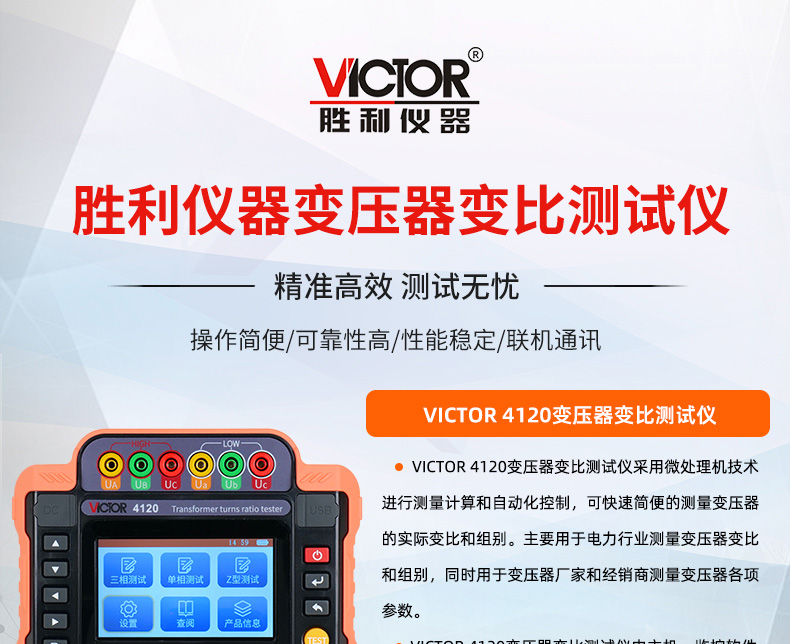 VICTOR 4120變壓器變比測試儀采用微處理機技術(shù)進行測量計算和自動化控制,可快速簡便的測量變壓器的實際變比和組別。主要用于電力行業(yè)測量變壓器變比和組別,同時用于變壓器廠家和經(jīng)銷商測量變壓器各項參數(shù)。