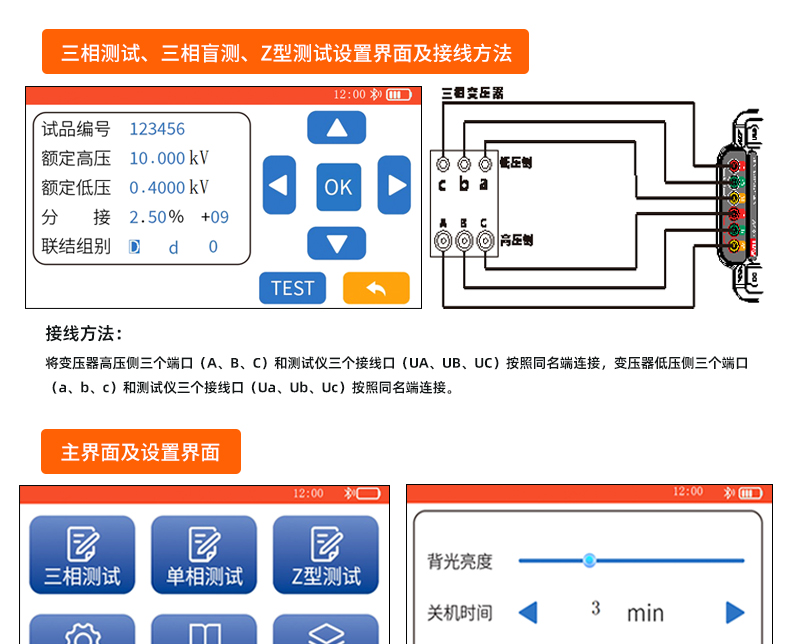 主要用于三相變壓器的變比和組別測試,單相變壓器、PT、CT的變比和極性測試。本產(chǎn)品可對三相變壓器進行盲測,也可對Z型變壓器進行變比和組別測試。 |