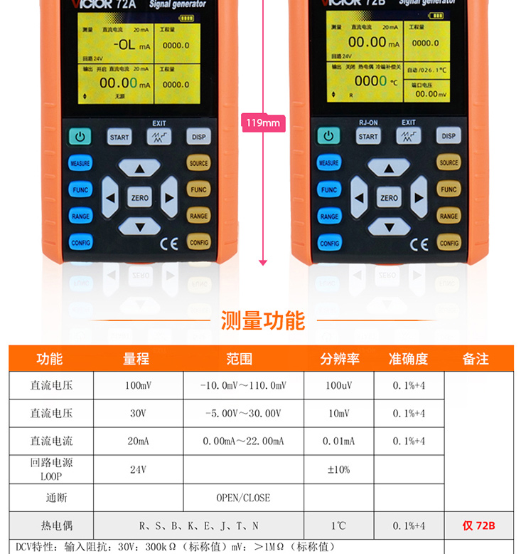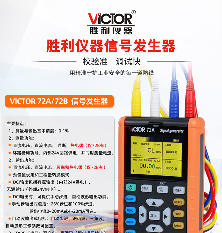 VICTOR 72A是一款鋰電池供電的便攜式掌上信號(hào)發(fā)生器,可用于測(cè)量直流電壓、直流電流、通斷,可模擬輸出直流電壓、直流電流。適用于現(xiàn)場(chǎng)變送器、DCS、PLC等系統(tǒng)的調(diào)試和校準(zhǔn)。VICTOR 72A在石油化工、生物制藥、工業(yè)自動(dòng)化、大專院校和科研機(jī)構(gòu)等領(lǐng)域的得到了廣泛的應(yīng)用,是工程師、技術(shù)工人及科研人員的“口袋級(jí)”實(shí)用工具。