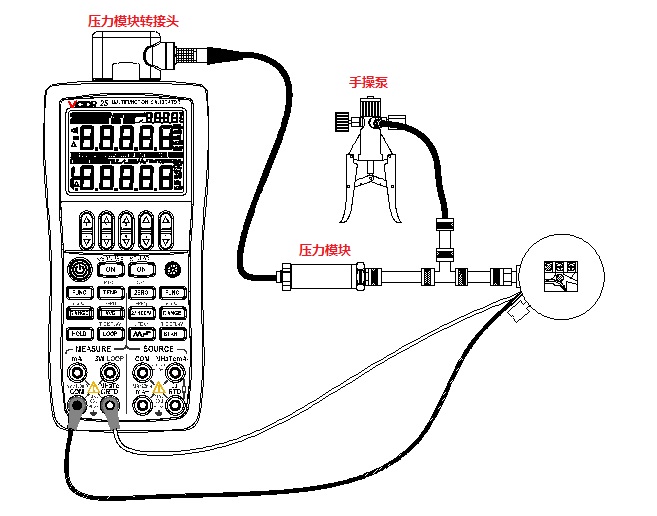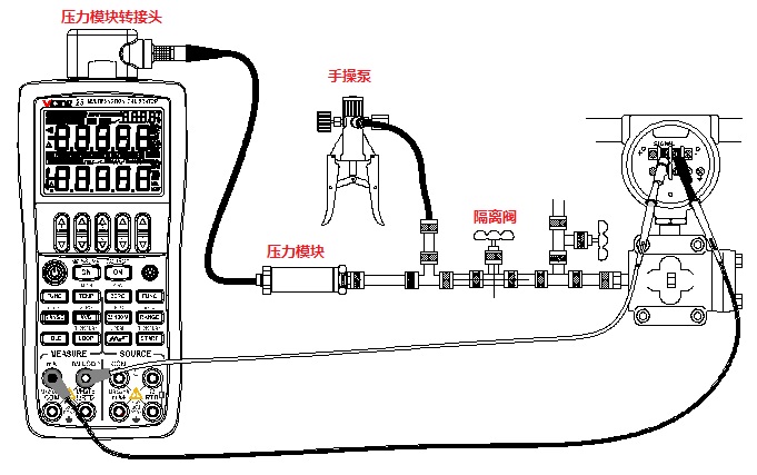 將VICTOR 25的輸入設置為提供回路電壓同時測量電流,輸出設置為壓力,通過改變外部壓力源的輸出壓力,便可對壓力變送器進行校準。
